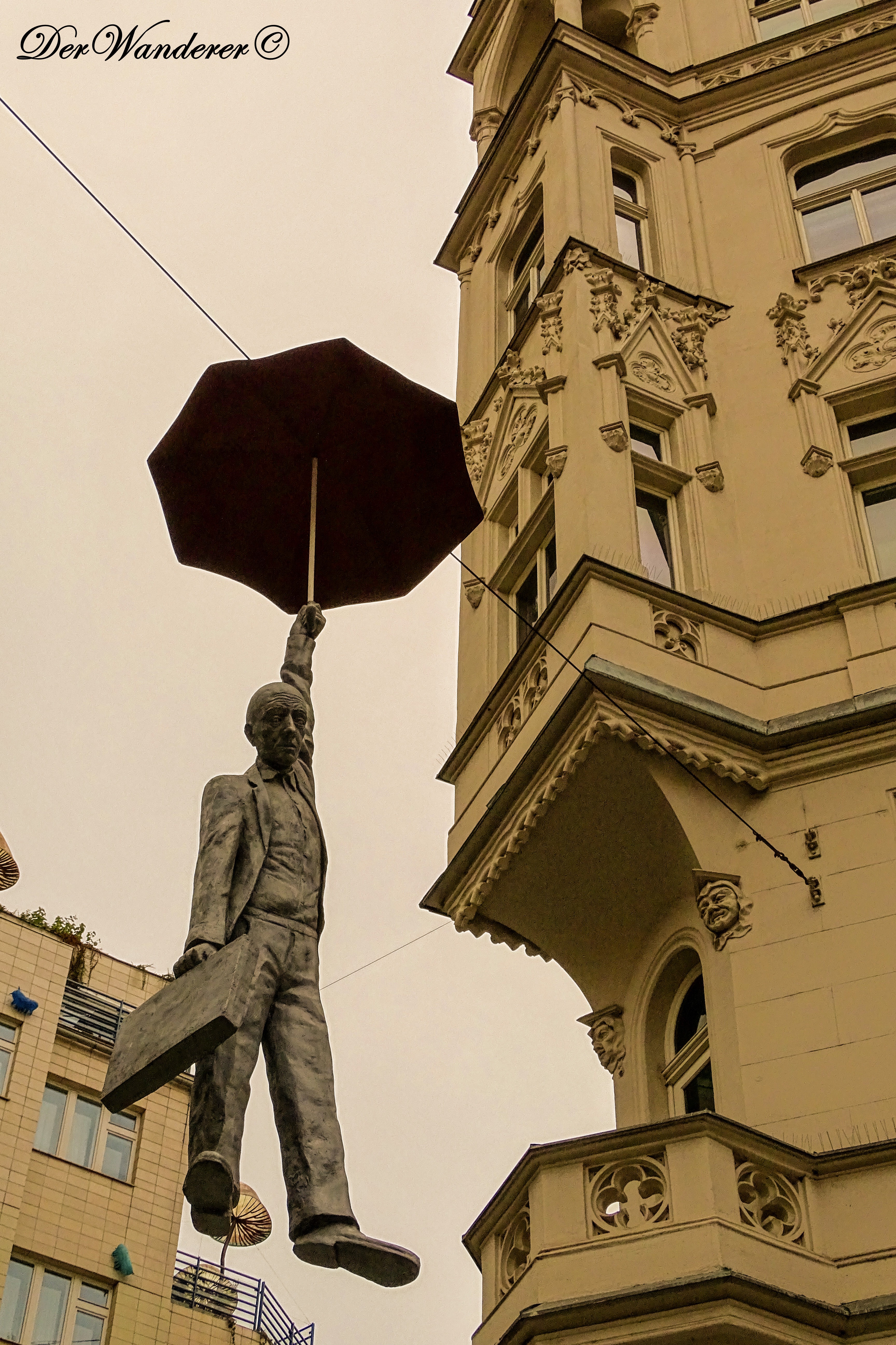 Passeggiando tra le vie della città nuova, non lontano dalla Casa Danzante, provate a dare uno sguardo verso l’alto e in una viuzza scorgerete un uomo con l’ombrello (opera di David Cerny) sospeso tra due palazzi!