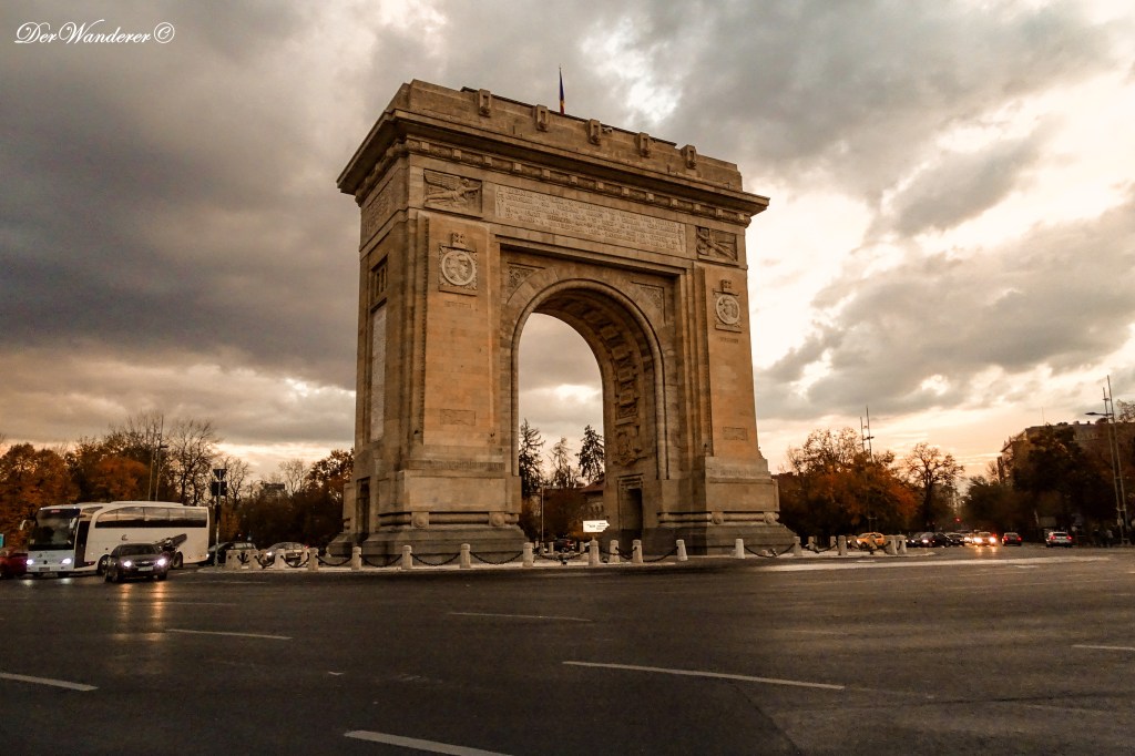 L’arco, alto 27 metri, non è quello costruito originariamente, bensì il terzo. Il primo arco trionfale fu costruito velocemente nel 1878 per commemorare l’indipendenza della Romania e per permettere alle truppe vittoriose di passarvi sotto al loro ritorno in città. Fu temporaneamente sostituito da un nuovo arco dopo la Prima Guerra Mondiale per poi arrivare alla versione attuale in pietra del 1936.
