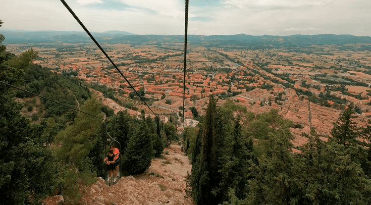 Un’esperienza da non perdere è sicuramente la funivia del Colle Eletto. Una bidonvia panoramica che vi consente di salire fino alla Basilica di Sant’Ubaldo. Per i più allenati si può, in alternativa, salire alla basilica seguendo il sentiero dei ceraioli, il cui nome deriva dalla tradizionale festa dei Ceri di Gubbio. Si svolge ogni anno il 15 maggio, alla vigilia della festa del protettore Sant’Ubaldo. I ceri sono tre alti e pesanti manufatti lignei sormontati dalle statue di Sant’Ubaldo (patrono dei muratori), Di San Giorgio (protettore dei merciai) e di Sant’Antonio Abate (protettore degli asinari e dei contadini). Essi vengono portati a spalla e di corsa per le vie della città fino alla basilica di Sant’Ubaldo, sulla vetta del Monte Ingino, dai ceraioli…pensate che faticaccia!