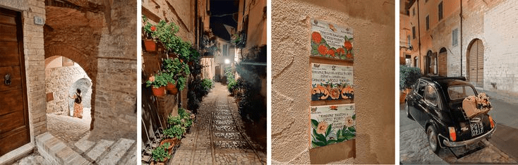 Complice il fatto di averla visitata di sera dopo cena, quando la folla di turisti ha ormai lasciato spazio al rumore del vento che soffia tra i vicoli, Spello, arroccato su uno sperone del Monte Subasio e che ti accoglie con le sue casette colorate di rosa, ci ha letteralmente stregato! Ci siamo volutamente persi tra le strette viuzze del centro storico decorate con bellissimi fiori colorati accompagnati solo dai passi di qualche gattino assonnato!