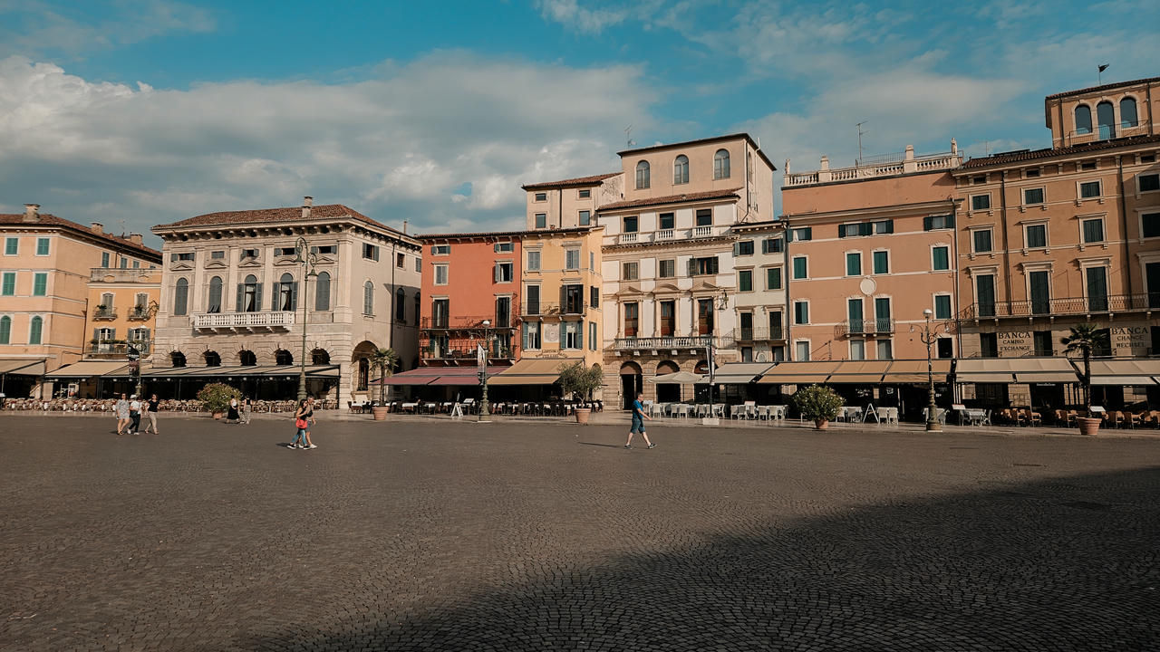Il nostro obiettivo è pedalare da una piazza all’altra delle due città. Quindi non possiamo non partire da Piazza Brà, cuore pulsante di Verona, immensa e maestosa con al centro l’Arena