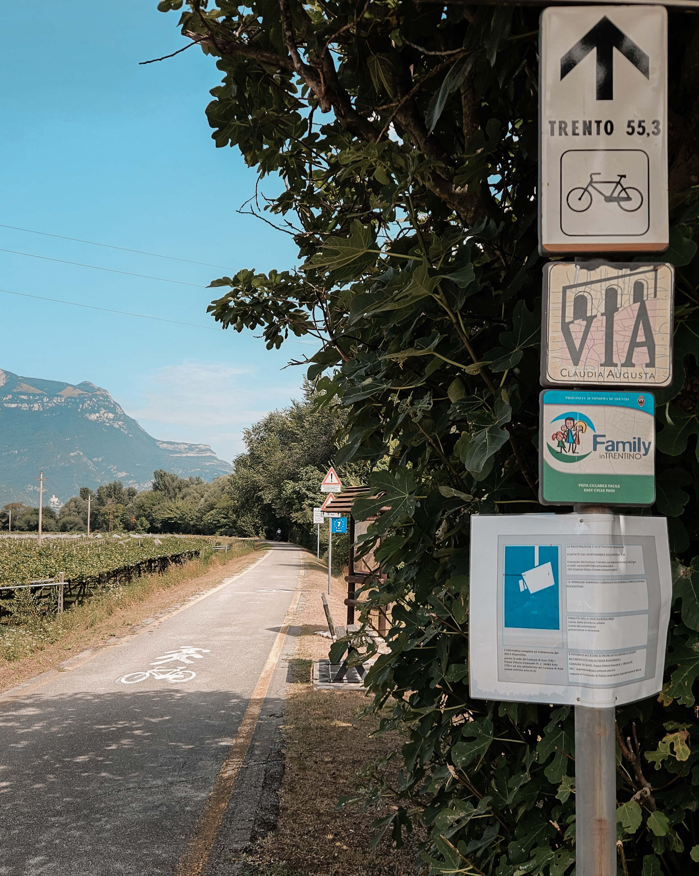 Lasciata Rivoli Veronese pedaliamo tra meleti e vigneti fino a Borghetto, il primo comune del Trentino! In questo primo tratto ciclabile che conduce al confine tra Veneto e Trentino, la Via Claudia coincide con la Ciclovia del Sole.