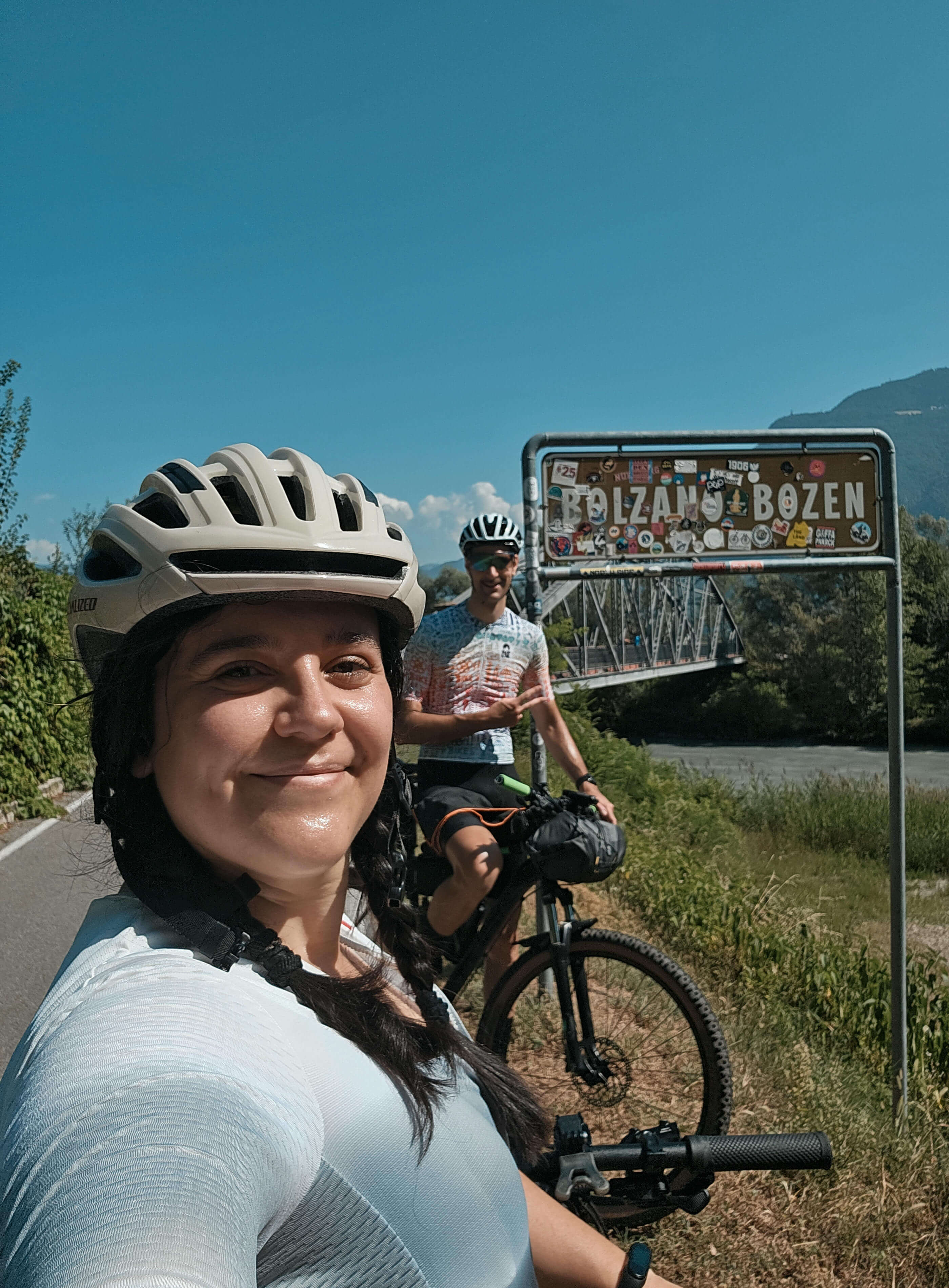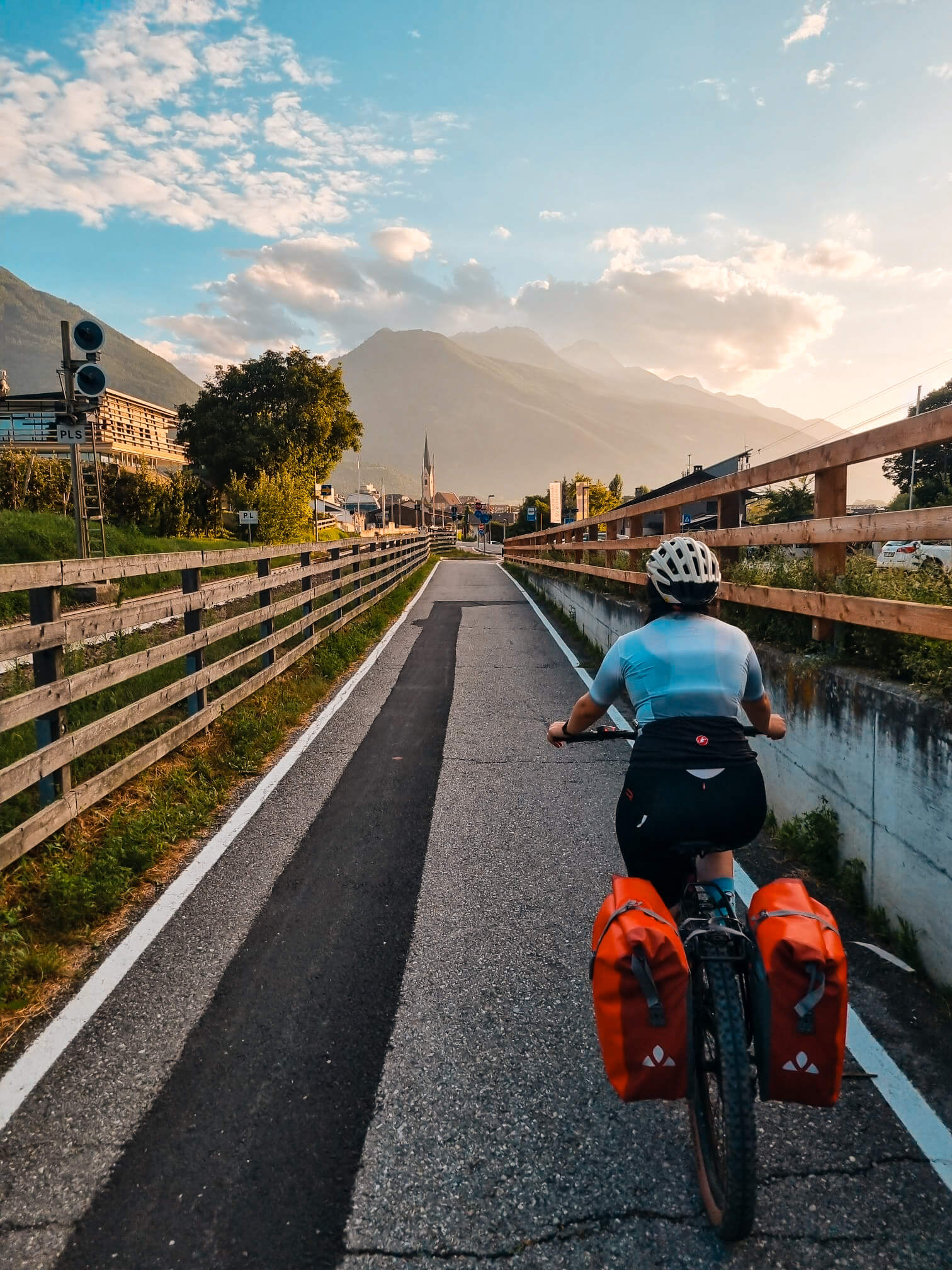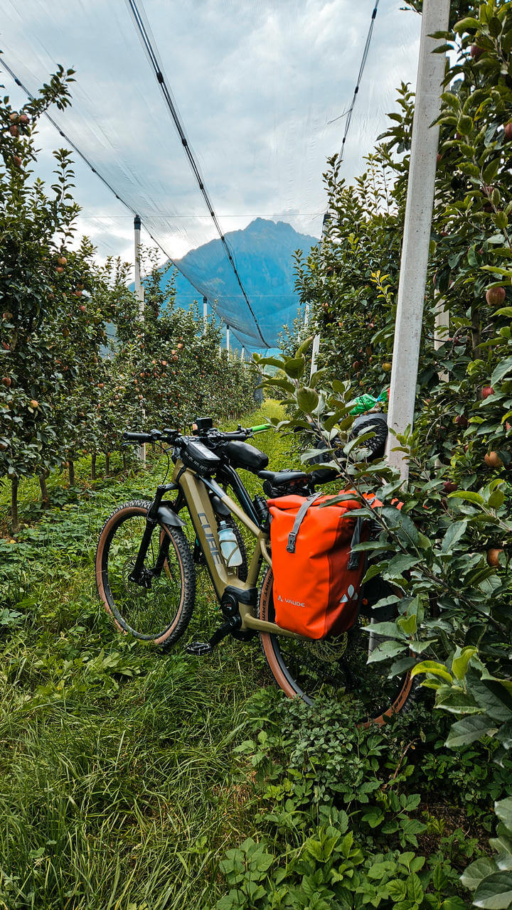 Da Merano percorriamo gli ultimi 20 chilometri della giornata verso il piccolo comune di Laces, dove trascorriamo la notte nell’accogliente appartamento della Signora Elisabeth. Per arrivare qui, pedaliamo tra i bellissimi meleti illuminati dalla calda luce del tramonto.