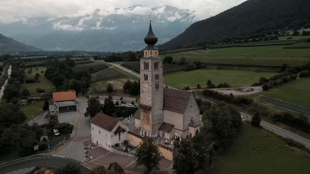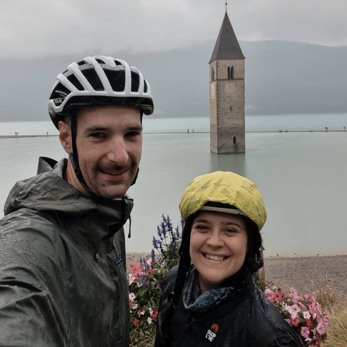 Sono solo le 9 del mattino, ma anticipatamente iniziano a scappare le prime gocce di pioggia. Riprendiamo quindi a pedalare in direzione Malles, dove ha inizio la panoramica (non oggi) salita al Passo Resia. I vigneti ci accompagnano fino a San Valentino alla Muta e al suo omonimo lago. Altri 10 chilometri e raggiungiamo il lago di Resia con il suo caratteristico campanile sommerso.