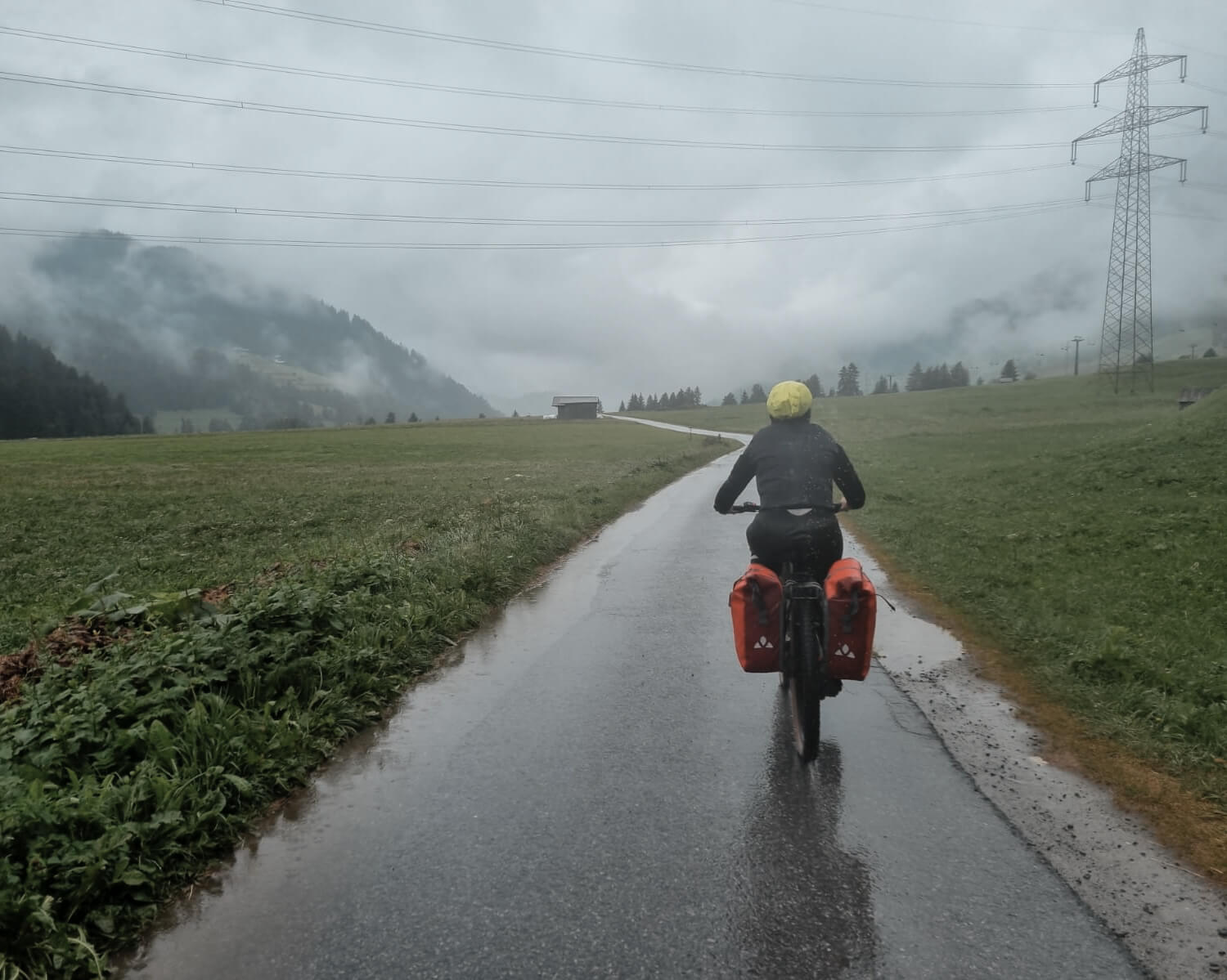 Purtroppo non riusciamo a goderci il bellissimo panorama sulle Alpi, ma, anche se vi suonerà alquanto strano, ho adorato pedalare in questo clima autunnale. Nuvole basse, freschino e il silenzio rotto solo dal rumore della pioggia!